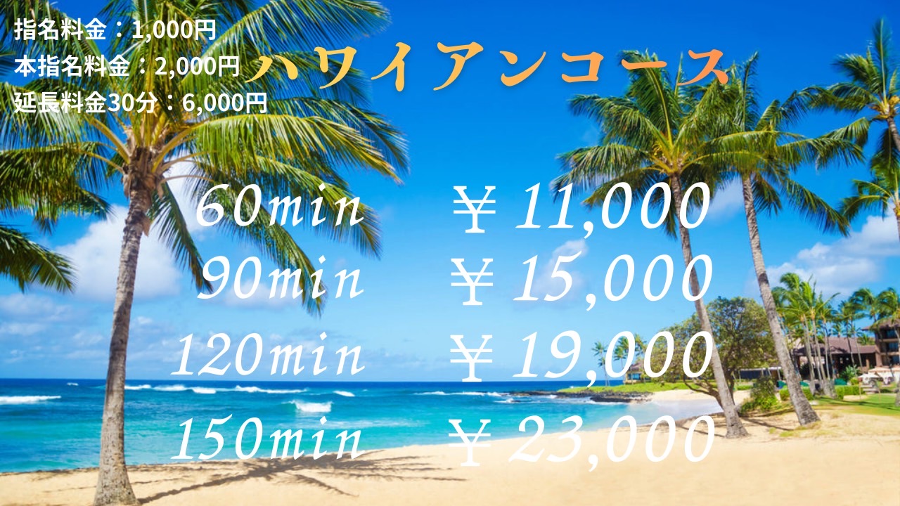 | 当店について | 日常を忘れ、南国ハワイのようなゆったりとした癒しの時間をお過ごしいただける、ハワイアンコンセプトのメンズエステです。 店内に一歩足を踏み入れれば、穏やかな波音、心地よいトロピカルミュージック、アロマの香りが広がり、まるでリゾートスパに滞在しているかのような空間が広がります。 ハワイ伝統のロミロミをベースにしたオイルトリートメントで、心身の疲れをゆっくりとほぐし、深いリラックスへと導きます。 セラピストは技術だけでなく、ホスピタリティにもこだわり、心から寛げる時間をご提供します。 都会の喧騒を離れ、南国の優しい空気に包まれる癒しのひとときをお楽しみください。 |